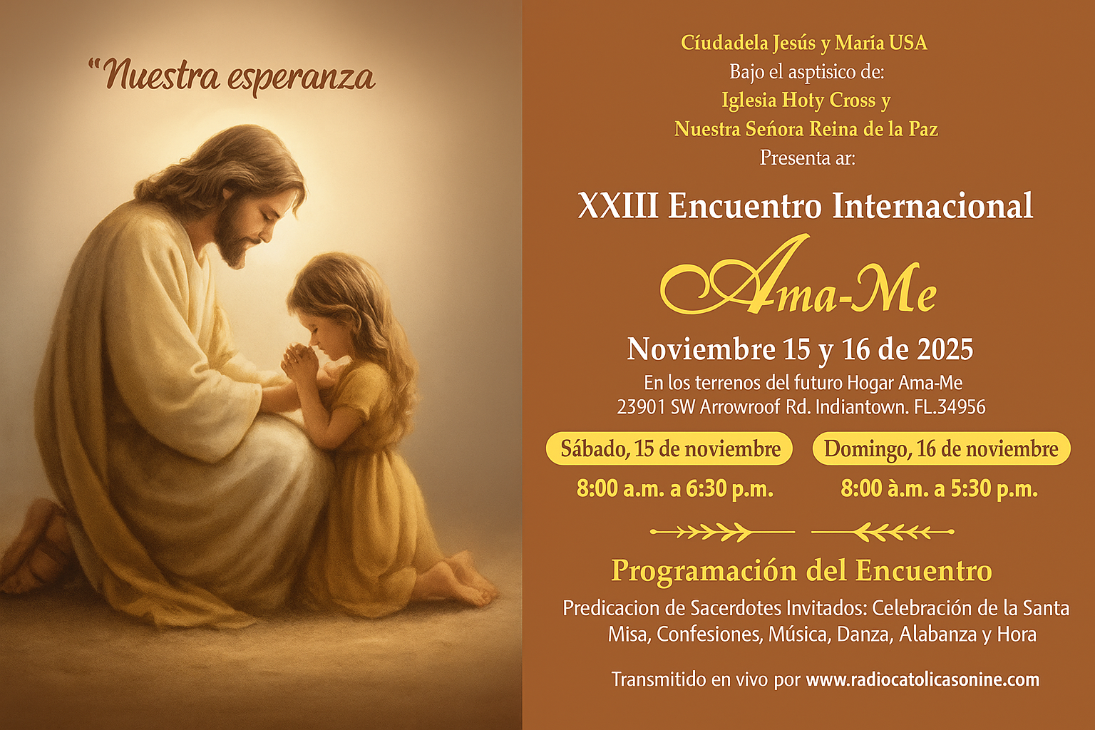 XXI Encuentro Internacional Ama-Me NOVIEMBRE 15 y 16, 2025 23901 SW Arrowroot Rd, Indiantown, Florida 34956 Para Mapa Pulse AQUI Información (954) 748- 4663 (954) 914-5777 (954) 749-1654 Contacto 954-914-5777 amameus@aim.com
